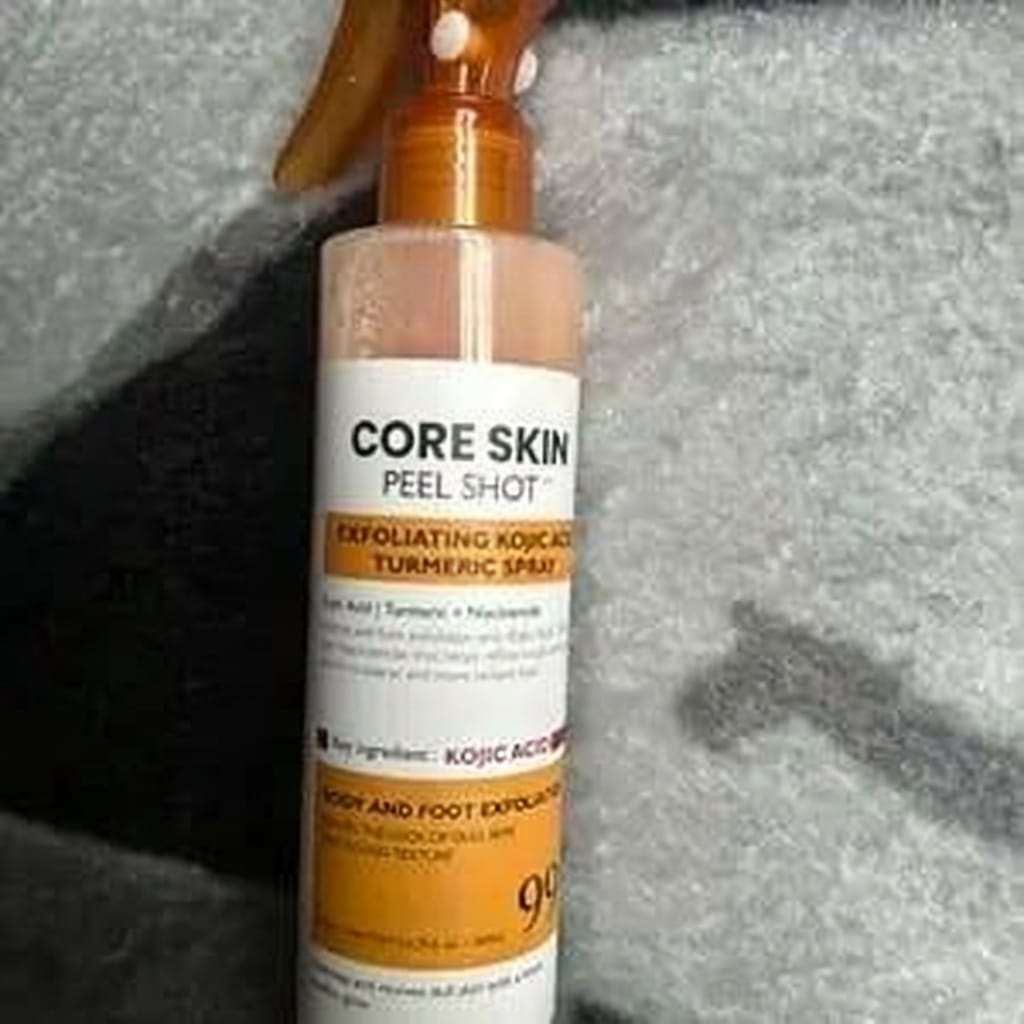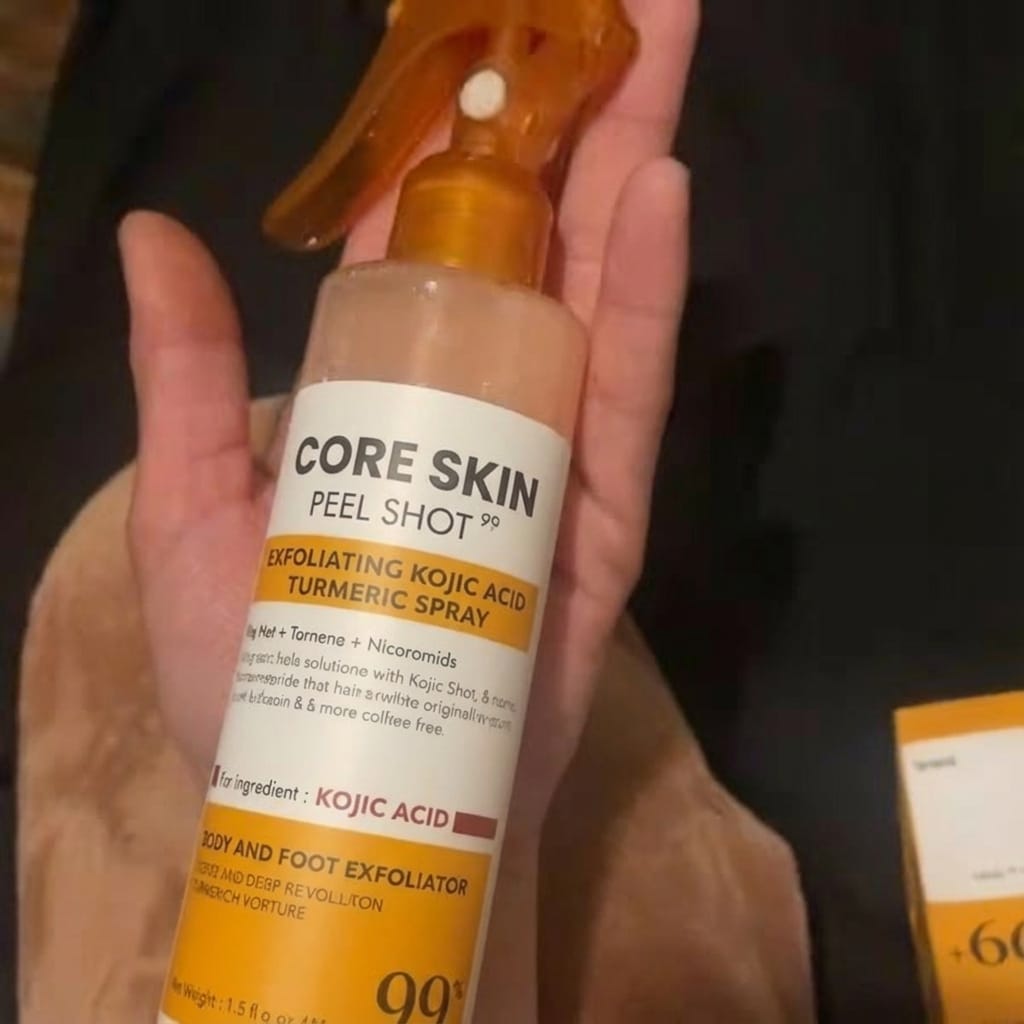 It exfoliates and brightens in one step. The spray removes built-up dead skin, oil, and impurities that cause rough texture, KP bumps, and dark patches — while Kojic Acid, Turmeric, and Niacinamide work to visibly even out skin tone and restore a healthy glow.